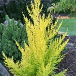 The Hesperocyparis macrocarpa ‘Goldcrest’ is a stunning evergreen conifer with golden foliage and a refreshing lemon scent. Perfect for small gardens or container planting.